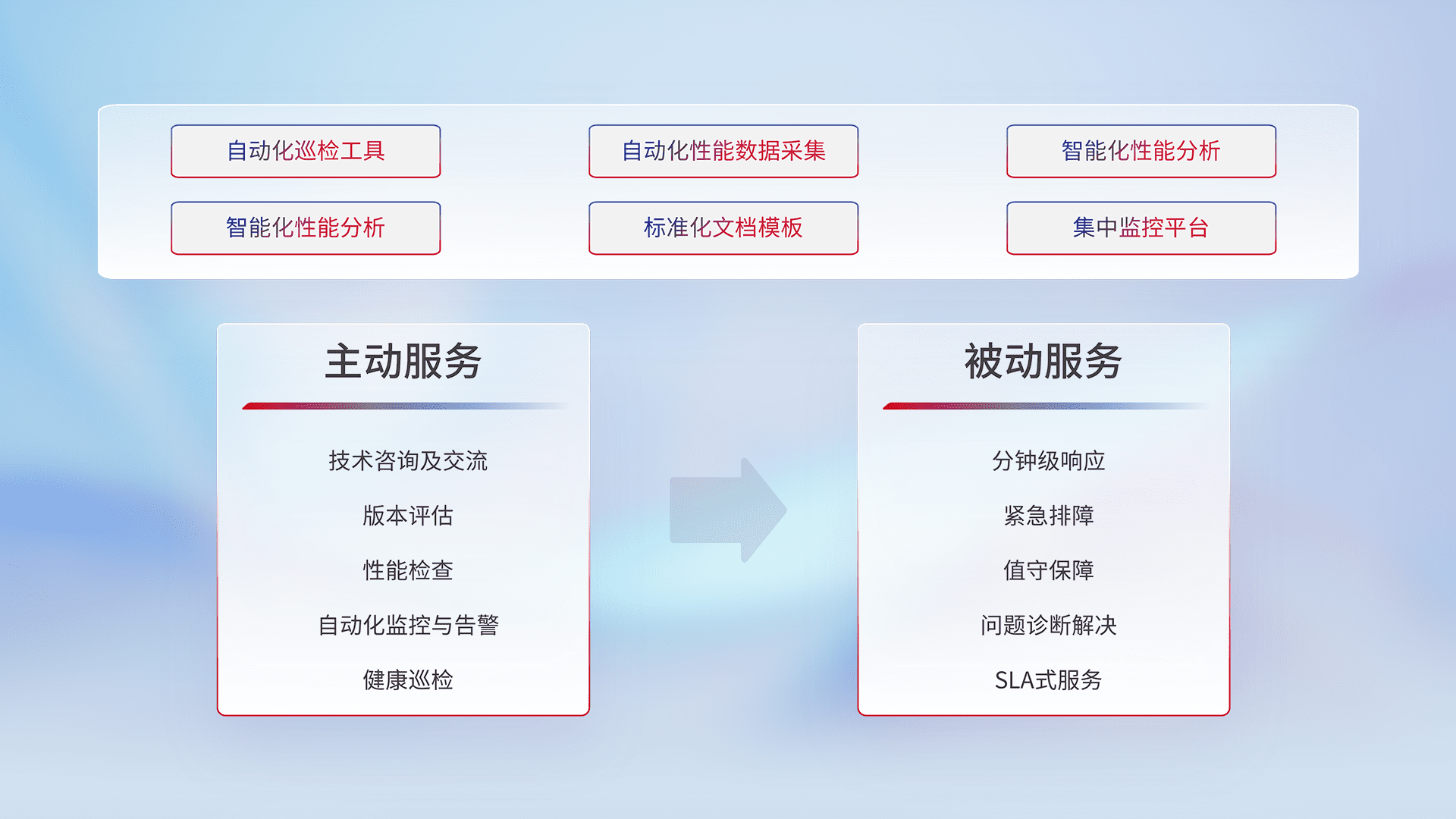 智能化工具和标准化文档,,保障服务质量,,,,提供主动服务(包含技术咨询、、版本评估、、、性能检查、、、自动化监控与告警、、、、健康巡检)和被动服务包含(分钟级响应、、、、紧急排障、、、、值守保障、、、、问题诊断解决、、SLA服务)。。。